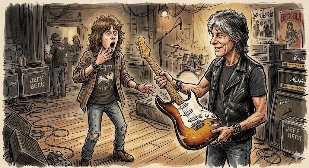 Rock guitar legend Jeff Beck handing me a Fender Stratocaster guitar